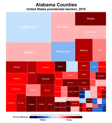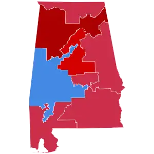 Alabama has voted for the Republican candidate in every election since it was won by Ronald Reagan in 1980. As such, Trump was heavily favored to win the state. On the day of the election, Trump won the election in Alabama with 62.08% of the vote, while Clinton received 34.36% of the vote.[3] The state had given 60.55% of its votes to Republican nominee Mitt Romney in 2012, meaning that it had shifted 1.53% more Republican from the previous election. Trump's margin of victory in Alabama was 27.72%, a 5.53% increase from Romney's 22.19% margin of victory. This makes it the largest loss by a Democrat since Democratic nominee George McGovern in 1972. On the other hand, Trump became the first Republican to win the White House without carrying Jefferson County since Richard Nixon in 1968, and Clinton the first Democrat since Adlai Stevenson II in 1952 to carry the county without winning the White House.