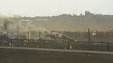 The first protest took place on 30 March 2018, during the Land Day. Some 30,000 Palestinians took part in the protests,[26] which were launched from five tent camps that were set up 500 to 700 metres (1,600 to 2,300 ft) from the Israel–Gaza barrier,[84] near the 300 metres (980 ft) no-go zone imposed by Israel. The majority of the demonstrators in the encampments were away from the border security and did not engage in violence.[24] Hundreds of young Palestinians, however, ignored warnings issued by the organizers and the Israeli military to avoid the border zone.[85] When some Palestinians began throwing stones and Molotov cocktails, Israel responded by declaring the Gaza border zone a closed military zone and opening fire at them.[24] The events of the day were some of the most violent in recent years.[86] In one incident, two Palestinian gunmen approached the fence, armed with AK-47 assault rifles and hand grenades, and exchanged fire with IDF soldiers. They were killed and their bodies were recovered by the IDF.[87][88][89]