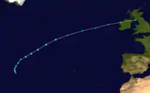 A complex non-tropical low pressure system formed over the northern Atlantic on August 12. As the low drifted southeastward and slowly weakened, a new low formed to the east of the system on August 14. The new low quickly acquired subtropical characteristics, and by 06:00 UTC on August 15, the low had organized sufficiently to be classified as a subtropical depression while situated about 740 mi (1,190 km) southeast of Cape Race, Newfoundland. Turning northeastward along the southern periphery of the mid-latitude westerlies, the subtropical depression intensified into Subtropical Storm Ernesto about six hours later. After Ernesto became a warm core system, with sufficient convective organization and anticyclonic outflow, the cyclone transitioned into a fully tropical storm late on August 16.[47] By the following day, Ernesto began accelerating northeastward due to the influence of the mid-latitude westerlies.[48] Around 18:00 UTC, the cyclone peaked with maximum sustained winds of 45 mph (75 km/h) and a minimum barometric pressure of 1,003 mbar (29.6 inHg). By six hours later, Ernesto transitioned into an extratropical low about 805 mi (1,295 km) north-northeast of the Azores. The low merged with a frontal system and continued east-northeastward until dissipating over the British Isles on August 19.[47] Heavy rains fell in portions of the United Kingdom on that day.[49]