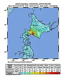 An earthquake measuring 6.6 Mw on the moment magnitude scale struck Iburi Subprefecture in southern Hokkaido, Japan, on 6 September 2018 at 3:08 a.m. JST. The earthquake's epicenter was near Tomakomai and occurred at a depth of 35.0 kilometers (21.7 mi). The Japan Meteorological Agency (JMA) registered a magnitude of 6.7 Mj and a maximum intensity of 7 on the shindo scale.[5] Shaking from the earthquake was felt strongly in Hokkaido and Aomori Prefecture, and shaking was felt as far away as the Kantō region.[6][7] Long period ground motion (LPGM) during the earthquake reached maximum of class 4 on the JMA LPGM intensity scales.[8] The earthquake disrupted electrical service throughout Hokkaido, leaving 5.3 million residents without power. Forty-one people were confirmed dead and six hundred and ninety-one were injured.[4] The event is officially known as Heisei san-jū-nen Hokkaidō Iburi tōbu jishin (平成30年北海道胆振東部地震, "Hokkaido Eastern Iburi Earthquake of Heisei 30").