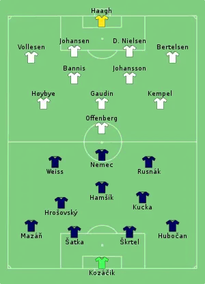 Adam Nemec opened the scoring for Slovakia in the 11th minute of the match with a header past goalkeeper Christoffer Haagh at the back post, following a chipped cross from Juraj Kucka on the right side. Denmark managed to create chances of their own, including two in the 25th minute after Kasper Kempel's cross was missed by Christian Offenberg and a shot from 11 metres (12 yd) out by Oskar Høybye went over the crossbar. Denmark held off the opposition attacks until the 37th minute, when Kucka registered his second assist of the match after laying a ball back to Albert Rusnák, who scored beneath the goalkeeper to put Slovakia up 2–0 at half-time.[6] Denmark remained well-organised and compact, despite finishing with one shot on target and only 27% possession.[38] The majority of the second period was played in Denmark's half, though the score remained unchanged until the 79th minute, when Danish substitute futsal player Adam Fogt scored an own goal past Haagh after failing to clear a low cross sent by Róbert Mak from the left and deflected by Michal Ďuriš.[39] Haagh made seven saves in the match, helping prevent a worse defeat for Denmark.[7]