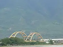 Officials confirmed that Palu's iconic bridge, the Kuning Ponulele Bridge (Jembatan Palu IV), which was also the first arch bridge in Indonesia,[57] was destroyed by the earthquake and the ensuing tsunami.[58] Roads to and from the city, connecting it to Makassar and Poso, were also severely damaged. There were also reports of landslides.[59]