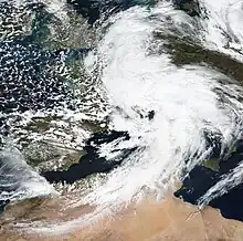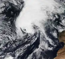 The precursor to Storm Bernardo was first noted as a deep low over north-eastern Canada on 7 November.[57] After considerably weakening and crossing the Atlantic without any notable impacts, the system was named Bernardo by the State Meteorological Agency of Spain (AEMET) on 9 November as it was approaching the Iberian Peninsula from the Bay of Biscay.[15] Bernardo crossed northern Spain and emerged into the Mediterranean Sea, affecting the Balearic Islands on 10 November with wind gusts of up to 111 km/h (69 mph; 60 kn) recorded in the Alfabia Mountains along the north-west coast of Mallorca.[58] On 11 November, Bernardo strengthened to its peak intensity of 996 mbar (29.4 inHg)[59] and formed an eye-like feature, leading several media outlets to report that the storm had medicane-like characteristics.[60] However, AEMET did not confirm that the storm had reached medicane status.[58]