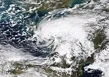Storm Amélie underwent explosive cyclogenesis on 2 November while located over the open north Atlantic,[46] reaching a minimum central pressure of 972 mbar (28.7 inHg).[47] Amélie subsequently made landfall on Brittany's Atlantic coast in the early hours of 3 November, bringing wind gusts of to 163 km/h (101 mph; 88 kn) at Cap Ferret. Amélie also brought wind gusts up to 170 km/h (110 mph; 92 kn) along the northern coast of Spain, including a record-setting 130 km/h (81 mph; 70 kn) gust for Santander Airport.[48] The highest wind gust recorded from Amélie was at Cagnano in Haute-Corse on Corsica, reaching 189 km/h (117 mph; 102 kn).[48]