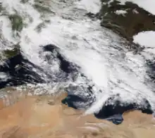 After losing its brief eye-like feature, Bernardo followed the coast of Algeria, remaining closely offshore as it moved eastwards across the Mediterranean before stalling over southern Italy for two days.[61][62][63] Bernardo then accelerated to the north-east as a weak frontal boundary, moving over the Baltic states on 14 November[64] and into northern Russia on 15 November.[65] After briefly reintensifying and then weakening once more, Bernardo was last noted as a weak low over Siberia on 18 November.[66]