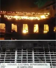Protesters set fire to electoral buildings and ballot boxes in the cities of Sucre and Tarija.[40] In Potosí, the COMCIPO march ended with the electoral court of the region being set on fire, damaging nearby homes.[49] Campfires and vigils by university students, supporters of Carlos Mesa and activists were set in other counting centers such as in Hotel Presidente, Hotel Real, Campo Ferial de Cochabamba. Police from Sucre were sent to Potosí to reinforce security and avoid possible disturbances before the vigil of citizens at the gates of the Departmental Electoral Court (TED), which denounced irregularities in the counting and computing of voting polls.[50]
