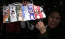 The Chuquisaca Departmental Electoral Court announced that the vote counting was being carried out in the municipality of Zudañez, because its facilities in the city of Sucre had been burned in the protests. The count was carried out in the meeting room of the Public Production Company Glass Containers of Bolivia.[68] Likewise, the Electoral Tribunal of Potosí ended the recount in the municipality of Llallagua, without notifying the delegates of the opposition political parties.[69] The counts show that in the municipalities of Zudañez and Llallagua the government party managed to obtain more than two thirds of the votes.[70]