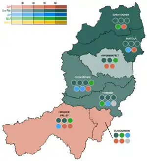![]() Mid Ulster 2019 Council Election Results by DEA (Shaded by plurality of FPVs) | ||||||||||||||||||||||||||||||||||||||||