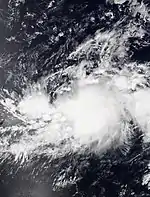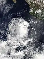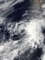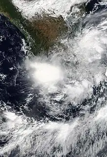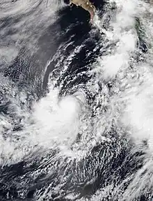 The tropical wave that spawned Cosme was succeeded a week later by another. It entered the East Pacific on July 8 but remained disorganized for several days while tracking west. The wave gave way to an area of low pressure on July 12, which then organized into a tropical depression only six hours later. The depression was located over very warm sea surface temperatures but under the influence of moderate wind shear, preventing organization. By July 12, persistent upper-level winds began to shear away the cyclone's convection. It degenerated to a remnant low at 00:00 UTC on July 14 while located south-southwest of Baja California Sur. The low produced intermittent bursts of convection as it moved west-northwest but ultimately dissipated early on July 15.[17]