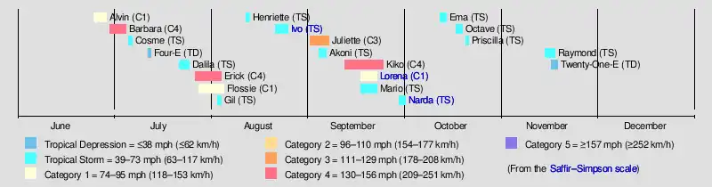 The season officially began on May 15 in Eastern Pacific and on June 1 in Central Pacific; both ended on November 30.[7] Initial activity was slow, with the first tropical depression forming on June 25.[8] The strongest storm of the season, hurricane Barbara, reached peak intensity on July 2 as a high-end category 4 hurricane. The season became more active in July, with five tropical cyclones forming, including two storms that intensified into hurricanes. Among them was Hurricane Erick, which reached Category 4 status on July 31.[9] This level of activity came to a halt in August, with only three named storms forming, none of which reached hurricane strength.
