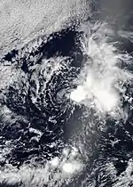 Early on September 4, the NHC began to track a quickly-developing area of low pressure about 1,100 mi (1,770 km) east-southeast of the Big Island of Hawaii.[25] Just a few hours later, following a sudden increase in convection, the system organized into Tropical Depression Twelve-E and moved into the Central Pacific basin.[26] It slowly intensified and eventually reached tropical storm status, whereupon it was named Akoni.[27] The system struggled to organize because of high wind shear and quickly degenerated into a remnant low on September 6.[28]