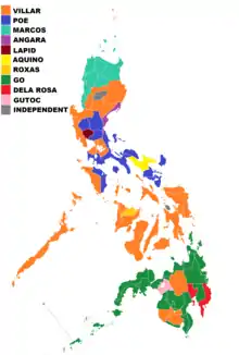 ![]() Map showing the number of winning HNP candidates if elections were done per province and city, with darker red shades denoting more candidates from HNP winning there. The winners are determined via the nationwide vote. | |||||||||||||||||||||||||||||||||||||||||||||||