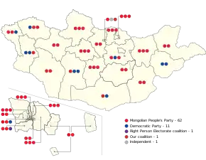 The Mongolian People's Party won with a supermajority of 62 seats, a slight drop from the 65 won in the prior elections. The centre-right Democratic Party won 11 seats. The candidate of Our Coalition, former State Great Khural member and vice chairperson of the Mongolian People's Revolutionary Party Sainkhüügiin Ganbaatar, won a seat, as did candidate of the Right Person Electorate Coalition and Chairperson of the National Labour Party Togmidyn Dorjkhand. Former Prime Minister of Mongolia Norovyn Altankhuyag won one seat as an Independent candidate.[10]