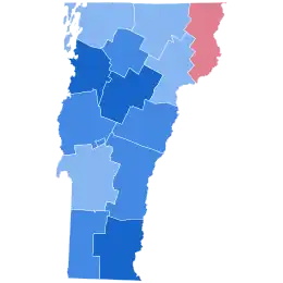 This is the first time Vermont was the strongest state for either party since 1956, when it was Republican Dwight D. Eisenhower's best state. Vermont also saw the largest increase in turnout from 2016, increasing 14.3%.[4] Biden greatly improved on Hillary Clinton's 55.7% vote share and 25.9% margin from 2016, when third-party candidates received over 14% of the vote.[5] Biden's performance was also the fourth-strongest Democratic performance in state history. Trump carried only one county, sparsely-populated Essex bordering New Hampshire, which had voted for the winner from 1980 to 2016. Consequently, Biden became the first president to win without the county since Jimmy Carter in 1976.