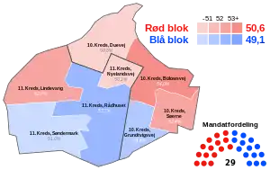 The result would see the Conservatives once again become the biggest party. However, for the first time in 112 years, it seemed as though they might lose the mayor's position. The traditional red bloc had won 15 seats and a majority. Only 416 votes had separated the two electoral alliances, in which the two blocs once again had entered. The Red–Green Alliance had become the biggest party of the red bloc, but it would be Michael Vindfeldt from the Social Democrats, who would become the new mayor, after an agreement was reached between themselves, the Danish Social Liberal Party, the Green Left and Red–Green Alliance. This would mark the first time in 112 years that the Conservatives would not hold the mayor's position of the municipality.[7][8]