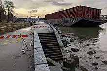 Skagit and Clallam counties also experienced major flooding events.[86] The Skagit River crested at 36.98 feet (11.27 m), near a record of 37.4 feet (11.4 m) set in 1990, but was held back in Mount Vernon by a downtown flood barrier installed in 2016.[87] The town of Hamilton was evacuated to shelters operated by the Red Cross on November 15.[88] In Clallam County, the Makah Reservation and Clallam Bay were cut off by a series of landslides that blocked sections of State Route 112 and U.S. Route 101.[89]