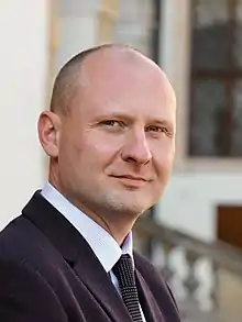 The Czech Pirate Party has been led by Ivan Bartoš since 2016. Under his leadership, they became the third largest party in the Czech Republic after the 2017 legislative election, with 22 seats.[3] Bartoš also led the party during the 2021 election, which the party contested as part of the Pirates and Mayors electoral alliance. Due to preferential voting, the Pirates received only 4 seats of the 37 seats won by the alliance. After the election, a part of the membership called for Bartoš's resignation.[4] The party joined the new government following the election.