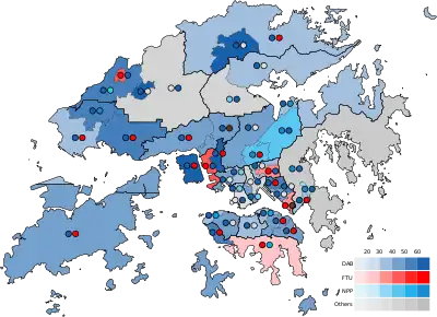 The largest pro-Beijing party, the DAB, became the largest party in the District Councils, having previously held that title from 2007 until the 2019 elections. The DAB was able to have one candidate elected in all except three geographical constituencies, and also won the largest percentage of the indirectly elected seats. Pro-labour FTU ranked second with 18 seats in direct elections, but was outperformed by the NPP in the District Committees seats.