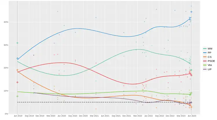 - ↑ "Estimación de voto. Municipios, grandes ciudades y Comunidades Autónomas (Estudio nº 3402. Abril 2023)" (PDF). CIS (in Spanish). 11 May 2023.