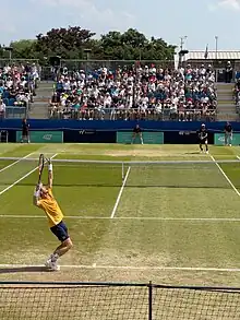 Andy Murray serving in the semi-final of the Surbiton Trophy.