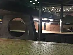 This underground station's only mezzanine is at the east end of station adjacent to the Manhattan-bound platform. Access to both platforms is via an overpass above the tracks, with staircases, escalators and elevators to platform level. At this point, the station has a high ceiling.[38] The platform walls as well as the floor are made of brick, and towards the top of the platform walls is a line of larger brown sheets, on these are the station signs at regular intervals that say "21 Street–Queensbridge." Above this is a thin black strip of metal and above this are yellow squares that take the platform walls up to the station ceiling that is made of concrete.[42] There are no columns between the two tracks or on the platforms, except near the mezzanine and overpass.[13][38]