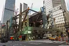 In July 2019, JPMorgan Chase signed an agreement with MTA in which the bank guaranteed that the demolition of 270 Park Avenue would not delay work on East Side Access.[33] That month, scaffolding was wrapped around the tower and podium structure on the Madison Avenue side of the building, the first step in an anticipated 18-month demolition effort.[34] But by late December 2020, only the podium structure had been demolished. Still, parts of the new superstructure were assembled on the Madison Avenue side,[35] and the following month saw the assembly of the new structure's first steel beams.[36] Demolition of the main tower was complete by April 2021; the entire demolition effort wrapped up in June.[37][38]