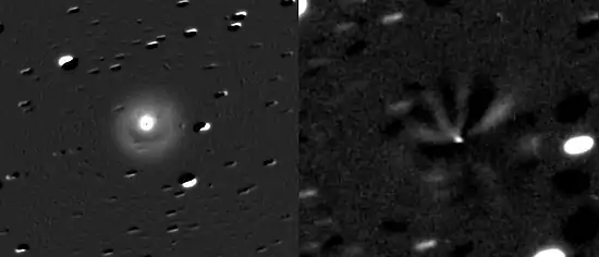 The comet is unusual in that while normally hovering at around 16th magnitude, it suddenly undergoes an outburst. This causes the comet to brighten by 1 to 5 magnitudes.[5] This happens with a frequency of 7.3 outbursts per year,[5] fading within a week or two. The magnitude of the comet has been known to vary from 18th magnitude to 10th magnitude, a more than thousand-fold increase in brightness, during its brightest outbursts. On 14 January 2021, an outburst was observed with brightness from 16.6 to 15.0 magnitude, and consistent with the 7.3 outbursts per year noted earlier.[6] Outbursts are very sudden, rising to maximum in about 2 hours, which is indicative of their cryovolcanic origin; and with the times of outburst modulated by an underlying 57-day periodicity possibly suggesting that its large nucleus is an extremely slow rotator.[7]