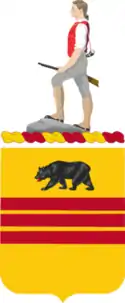 The 308th Cavalry's coat of arms was approved on 9 July 1925, and its distinctive unit insignia was approved on 13 March 1926. Both were rescinded on 17 February 1959. The distinctive unit insignia included a 1 1/8 in (2.86 cm) gold colored metal and enamel device, which consisted of a shield with three red bars in the center below a bear, and a red and gold scroll below the shield, which was inscribed with the regimental motto, "Nunquam non paratus". The shield symbolized the United States Cavalry, the bear, similar to that on the Seal of California, represented the unit's California service in World War I, and the red bars symbolized three World War I field artillery units that were included in the regiment's lineage. The motto was Latin for "Never unprepared". The regiment's coat of arms was similar to the distinctive unit insignia except that it added the Organized Reserve crest, a Minuteman, and omitted the motto.[6]