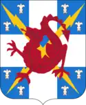 The shield is Azure, a cross quarter-pierced Argent and overall two lightning bolts in saltire Or between in each quarter as many fleurs-de-lis of the second; overall a dragon passant Gules.[3]