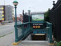 The 36th Street station is an express station on the BMT Fourth Avenue Line of the New York City Subway, located at 36th Street and Fourth Avenue in Sunset Park, Brooklyn. It is served by the D, N, and R trains at all times.[5] During rush hours, several W and northbound Q trains also serve the station.[lower-alpha 1]