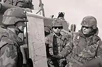 By the fifth day of combat, 28 February, the division had achieved all of its original objectives. It had cleared Objective Dorset after meeting stiff resistance and destroying more than 300 enemy vehicles.[30] The 3rd Brigade, 3AD had also captured 2,500 enemy prisoners.[30][31] The division was now pushing east to block the Iraqi retreat from Kuwait and conduct mopping up operations.[28] Less than one hundred hours after the ground campaign started, President Bush declared a ceasefire.