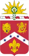 The shield is scarlet for Artillery. The Civil War is represented by the chevron and four stars, one for each battery in that war. The lion's face, dragon and fleur-de-lis allude to the War of 1812. China Relief Expedition and World War I, respectively. The rising sun indicates the regiment dates back nearly to the dawn of this country's history (Battery "D" was organized in 1802), and the Aztec banner is for the Mexican War.
