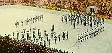 In its first year, the band was organized with a total strength of 14 pipers and 5 drummers combined. During World War I, the pipe band accompanied the regiment to Europe where it led it into battle.[3] The pipes and drums have played at every Toronto Maple Leafs home opening game at both Maple Leaf Gardens and the Air Canada Centre since their performance at the opening of the new Maple Leaf Gardens on 12 November 1931 at the request of Conn Smythe (a major in the First World War).[4][5] It performed in Toronto for the Trooping of the Colour in 1967 and the Scottish World Festival at the Canadian National Exhibition from 1972 to 1981. In 1985 it performed in the Netherlands for the ruby jubilee of the liberation of that country. In 1987, it was invited to perform in Bermuda and that same year, it participated in the Royal Nova Scotia International Tattoo. In 1990, the pipe band was the largest military pipe band in the Commonwealth of Nations.[6] In 1999, the pipe band lead the parade from Maple Leaf Gardens to the Air Canada Centre, when the Maple Leafs moved there for their area of operations. The regimental pipe and drums provided musical accompaniment for the G7 summit in 1988 and for Queen Elizabeth II in 1998.