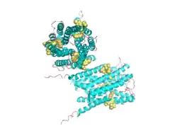 - 1 2 PDB: 2q7r;Ferguson AD, McKeever BM, Xu S, Wisniewski D, Miller DK, Yamin TT, Spencer RH, Chu L, Ujjainwalla F, Cunningham BR, Evans JF, Becker JW (July 2007). "Crystal structure of inhibitor-bound human 5-lipoxygenase-activating protein". Science. 317 (5837): 510–2. Bibcode:2007Sci...317..510F. doi:10.1126/science.1144346. PMID 17600184. S2CID 31544959.