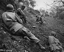 For the remainder of their eight-week stay in the Anzio beachhead, the men of the 504th found themselves fighting defensive battles instead of the offensive operations for which they were better suited and had been trained. For the first time the men were engaged in static trench warfare like that of World War I a generation before, with barbed wire entanglements and minefields in front and between alternate positions. It was during this battle that the 504th acquired the nickname "The Devils in Baggy Pants," taken from the following entry found in the diary of a Wehrmacht officer killed at Anzio:[1]