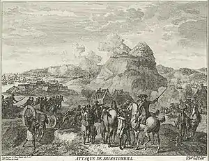 The regiment returned to North America for the American Revolutionary War.[9] The regiment fought at the Battle of Long Island in August 1776 and the Battle of Princeton in January 1777.[9] It went on to take part in the Philadelphia campaign and saw action at the Battle of Brandywine in September 1777, the Battle of Paoli later that month and the Battle of Germantown in October 1777.[9] The regiment was transferred to the West Indies in November 1778 and saw action at the Battle of St. Lucia in December 1778.[2] Most of the regiment were captured at the siege of Brimstone Hill in February 1782 during the French invasion of Saint Kitts.[7] The regiment adopted a county designation as the 55th (the Westmoreland) Regiment of Foot in August 1782.[3]