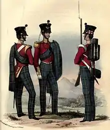A second battalion was again raised in October 1804 but remained in Scotland throughout the War.[2] The 1st battalion embarked for the Cape of Good Hope in August 1805 and took part in the Battle of Blaauwberg in January 1806.[17] The battalion then sailed for South America and took part in the disastrous expedition against Buenos Aires under Sir Home Popham. The battalion was taken prisoner and the Regimental Colours were captured.[18] New colours were presented to the regiment by Lieutenant-General Sir John Floyd in April 1808.[19]