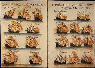 There is conflict between various chroniclers over the exact composition, or the names of ships and captains. João de Barros reports 22 ships and 20 captains;[7] Castanheda says 15 carracks and 6 caravels, 20 captains; Gaspar Correia 8 large carracks (naus), 6 small ships (navetas), 6 caravels, and 21 captains; Relacão das Naos 14 carracks, 6 caravels, 22 captains.[8]