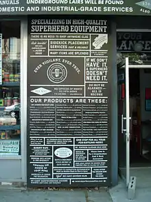 826NYC is located in a "secret lair" behind The Brooklyn Superhero Supply Company,[1] a store similar in eccentricity to 826 Valencia’s storefront pirate shop, and which sells capes, grappling hooks, utility belts (new and vintage), masks, tights, deflector bracelets, bottles of chaos and anti-gravity, secret identity kits, and more. Visitors to the store can try out capes for free in a cape-testing wind tunnel (essentially a series of fans on a pedestal). The store sells new and back issues of Timothy McSweeney's Quarterly Concern, The Believer, Wholphin, and other McSweeney's publications. The Brooklyn Superhero Supply Co. also carries a complete stock of publications written and edited by students at 826NYC including Trapped: The Encyclopedia of Escape, Sonny Paine, and issues 1 and 2 of The 826NYC Review. The store front is literally a front for the charitable organization, with all sales going to the organization. The store employs volunteers.