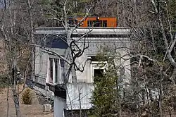 Mensch undertook a substantial renovation. He cut a huge, floor-to-ceiling window in the gorge-facing side of the formerly windowless tomb. He built a one-story addition with three bedrooms just below the tomb, a glass pavilion on the same level as the tomb, and a new parking spot and building for the entry staircase. He did large parts of the construction work himself, and held his office hours on the site.[5] "One no longer has the sense of entering an ancient, shadowy, secret chamber in a remote location," a journalist wrote. "It's a good deal more like finding an unsuspected open-air museum set in the midst of a small but lovely park overlooking the city."[4]
