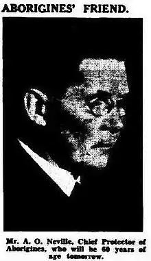In 1915, Neville became the state's second appointment to the role of the Chief Protector of Aborigines. During the next quarter-century, he presided over the controversial policy of removing Aboriginal children from their families; children who came to be called the Stolen Generations. In 1936, Neville became the Commissioner for Native Affairs, a post he held until his retirement in 1940.[2]