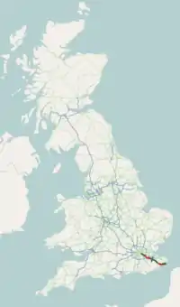| Hawkinge | 66.7– 67.2 | 107.3– 108.1 | Grade–separated junction; Folkestone signed westbound only | ||