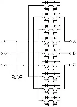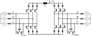 There is the alternative option of indirect energy conversion by employing the Indirect Matrix Converter (Fig. 5) or the Sparse matrix converter which was invented by Prof. Johann W. Kolar from the ETH Zurich. As with the DC-link based VSI and CSI controllers (Fig. 2 and Fig. 3), separate stages are provided for voltage and current conversion, but the DC-link has no intermediate storage element. Generally, by employing matrix converters, the storage element in the DC-link is eliminated at the cost of a larger number of semiconductors. Matrix converters are often seen as a future concept for variable speed drives technology, but despite intensive research over the decades they have until now only achieved low industrial penetration. However, citing recent availability of low-cost, high performance semiconductors, one larger drive manufacturer has over past few years been actively promoting matrix converters.[11][12]