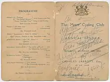 Dixon was a member of the Motor Cycling Club and attended their 1913 Annual Dinner that was held at the Trocadero Restaurant. The photographs show the menu card that Dixon kept. It has signatures of the leading lights if the motorcycle world who became really big in the motor trade - Charles Jarrott who became head of the Automobile Association; Lionel Martin and Robert Bamford who went on to start Aston Martin. . The menu was donated to the National Motorcycle Museum by the family in 2019.