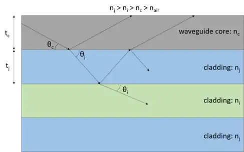 The refractive indexes of the guiding core (nc) and the cladding layers (nj, ni) are important and are carefully chosen. In order to make anti-resonance happen, nc needs to smaller than nj. In a typical system of a solid core ARROW, as shown in the figure, the waveguide consists of a low refractive index guiding core bounded on the upper surface by air and on the lower surface by higher refractive index antiresonant reflecting cladding layers. The confinement of light on the upper surface of the guiding core is provided by the total internal reflection with air, while the confinement on the lower surface is provided by interference created by the antiresonant cladding layers.