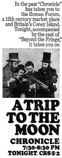 "A Trip to the Moon" is a 1964 television science fiction comedy film, produced as an episode of the CBS series Chronicle. The script was written by Jonathan Miller and Robert Goldman, based on Jules Verne's 1865 novel From the Earth to the Moon. All characters are portrayed by Alan Bennett, Peter Cook, Miller, and Dudley Moore, who had first worked together in the revue Beyond the Fringe.