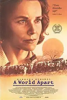 A World Apart is a 1988 anti-apartheid drama film and directed by Chris Menges and starring Barbara Hershey, David Suchet, Jeroen Krabbé, Paul Freeman, Tim Roth, and Jodhi May. Written by Shawn Slovo, it is based on the lives of Slovo's parents, Ruth First and Joe Slovo. The film was a co-production between companies from the UK and Zimbabwe, where it was filmed. It features Hans Zimmer's first non-collaborative film score.