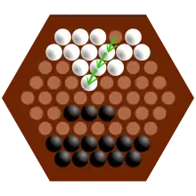 The board consists of 61 circular spaces arranged in a hexagon, five on a side. Each player has 14 marbles that rest in the spaces and are initially arranged as shown below, on the left image. The players take turns with the black marbles moving first. For each move, a player moves a straight line of one, two or three marbles of one color one space in one of six directions. The move can be either broadside / arrow-like (parallel to the line of marbles) or in-line / in a line (serial in respect to the line of marbles), as illustrated below.[2]