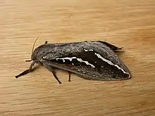 The wingspan is up to 120 millimetres (4.7 in) for males and 170 millimetres (6.7 in) for females. The moths have fawn coloured wings with two silver flash markings across each fore wing.[3] They can be the same size as a small insectivorous bat, and owls often prey on them.[2] The body reaches a length of 120 mm.[5]