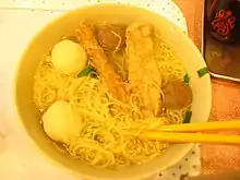A bowl of "Fish Ball Noodles" with fish balls, meatballs and fish spring rolls.